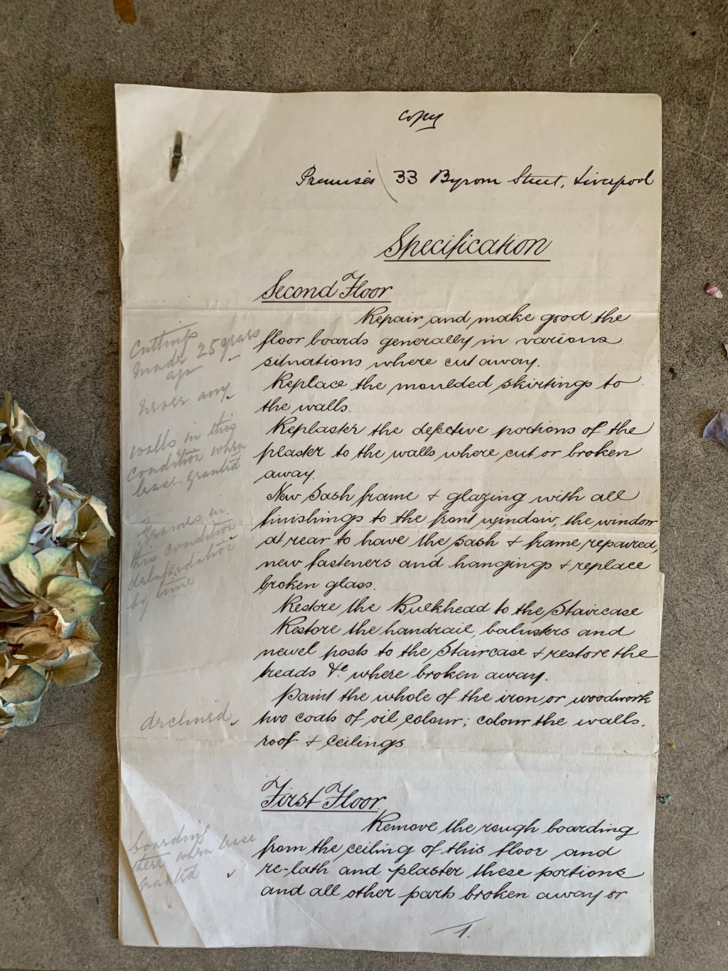 Antique Handwritten 4-Page "Specifications" to 33 Byron Street, Liverpool