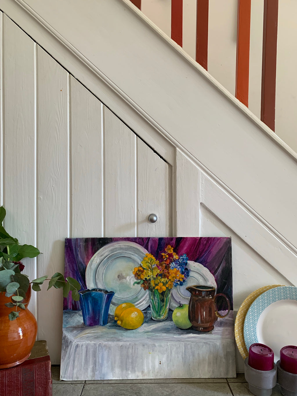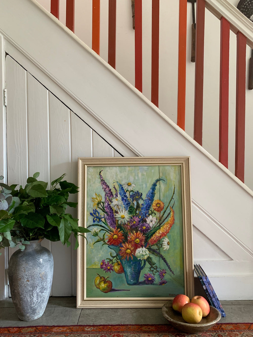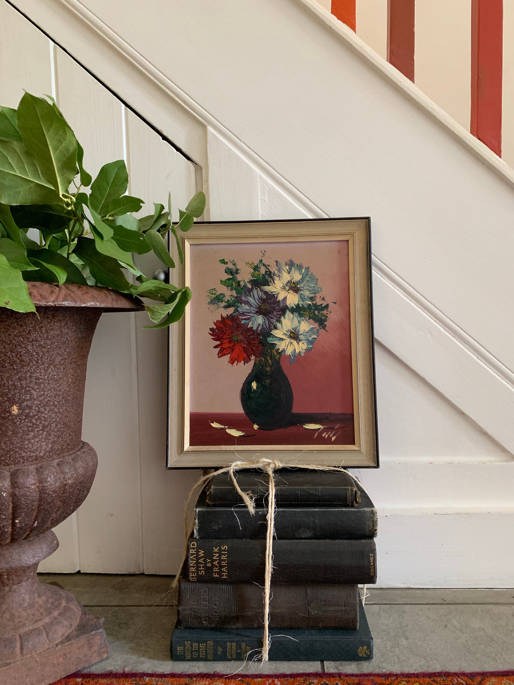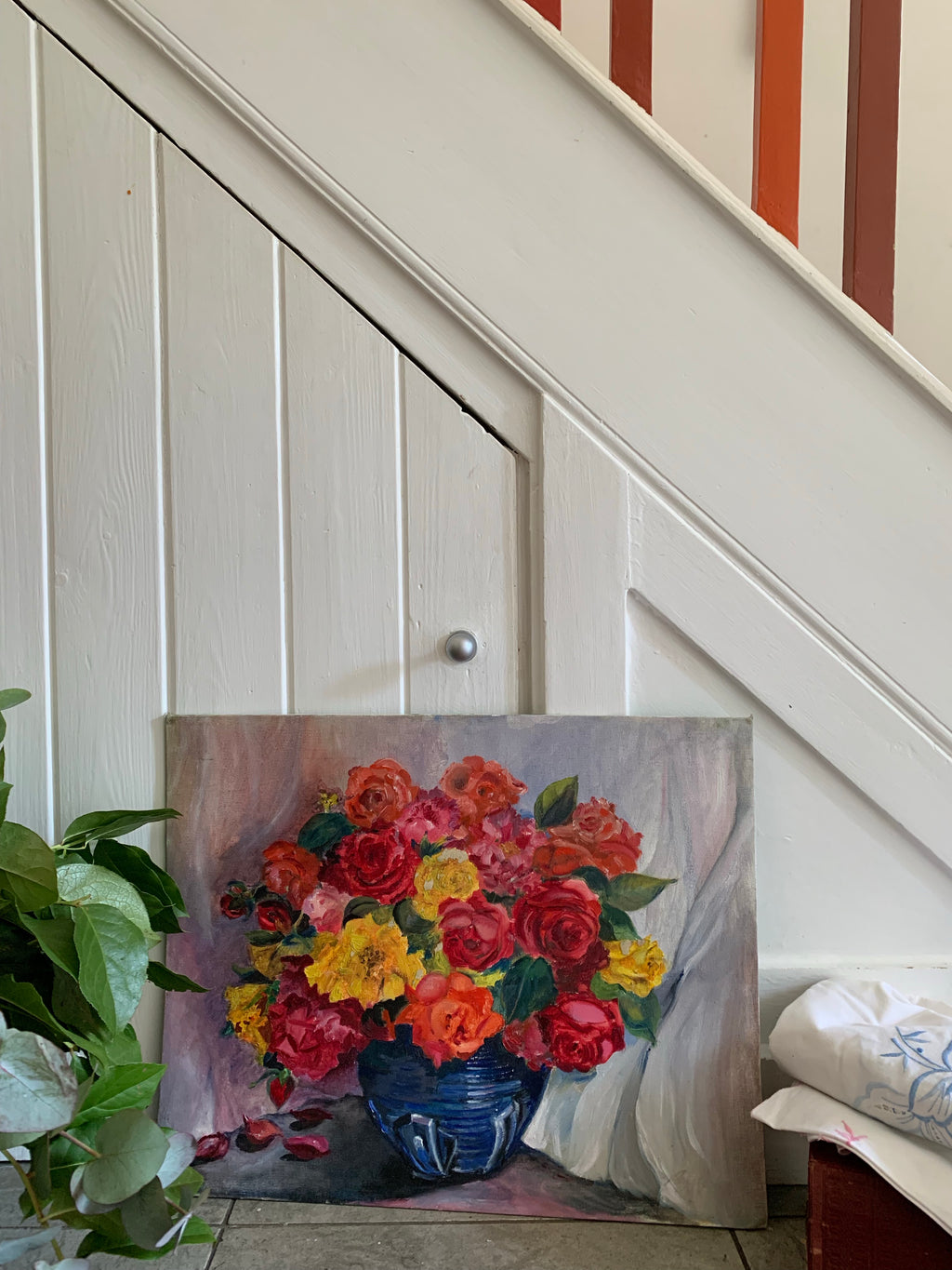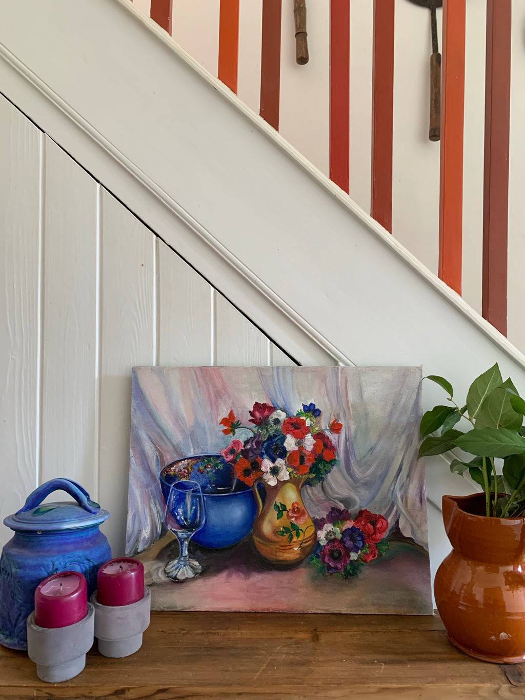 Still-Life Oil Painting on board, with flowers and blue bowl