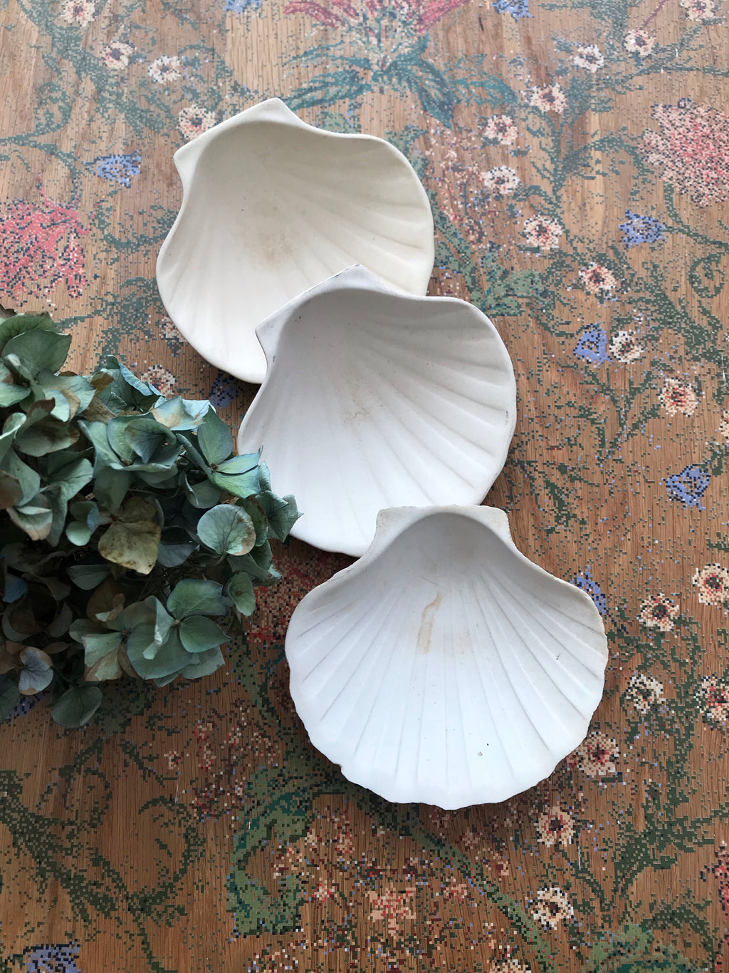 Trio of French vintage bisque porcelain scallop dishes