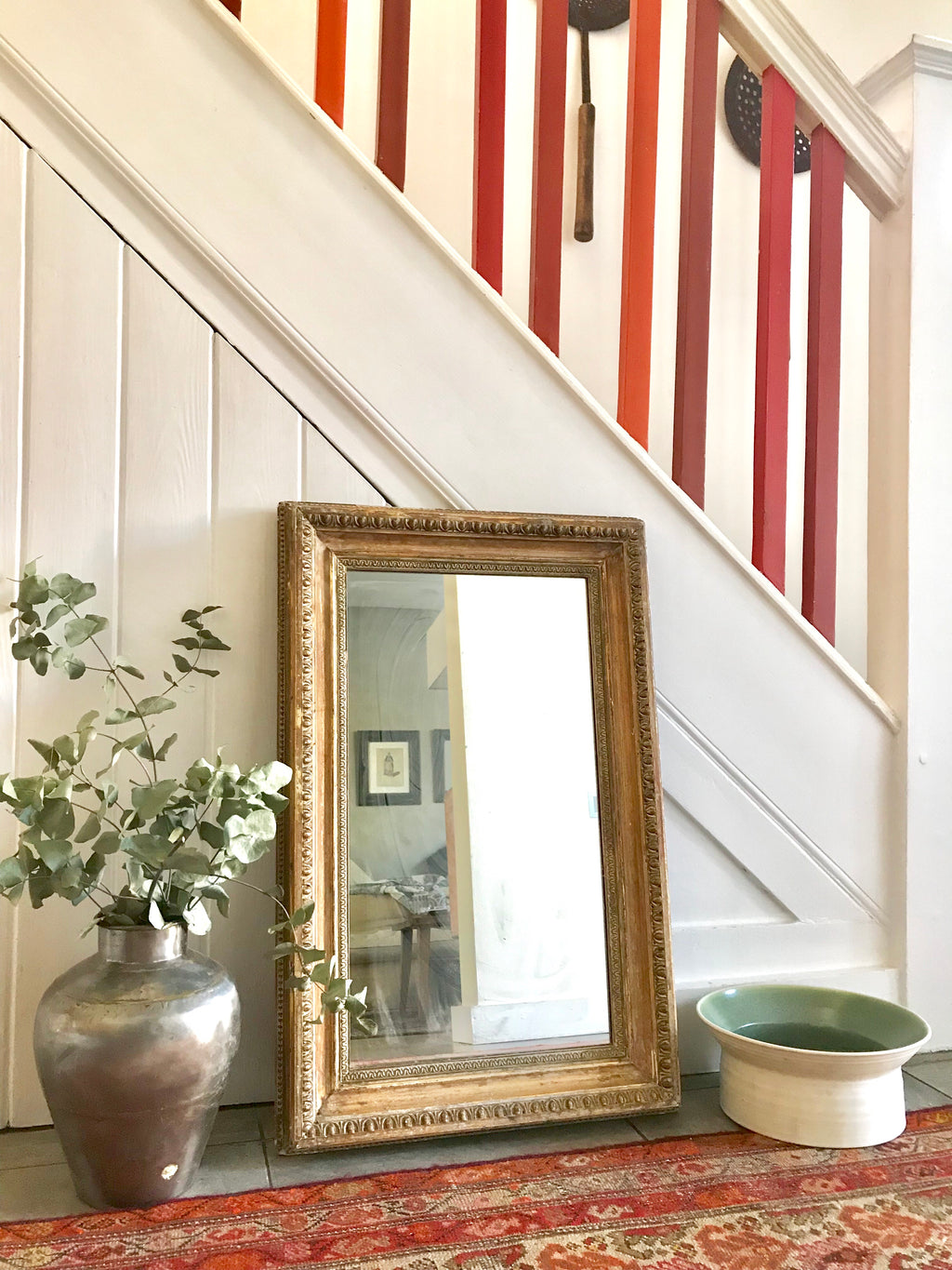 Large Rustic Vintage Mirror with ornate frame in gold and beige