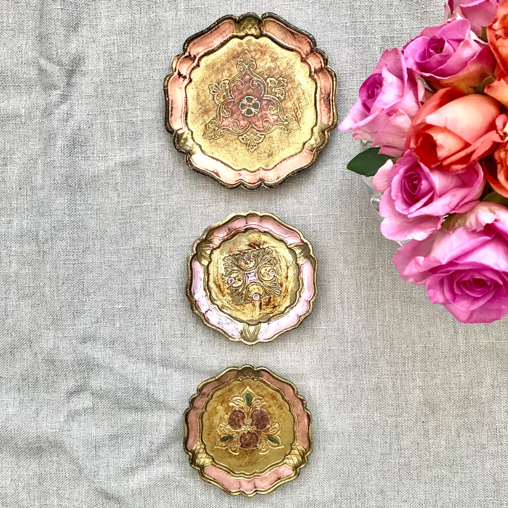 Set of Five Vintage Italian Florentine Coasters - Muted Pinks,Whites & Blue