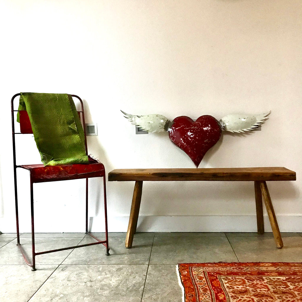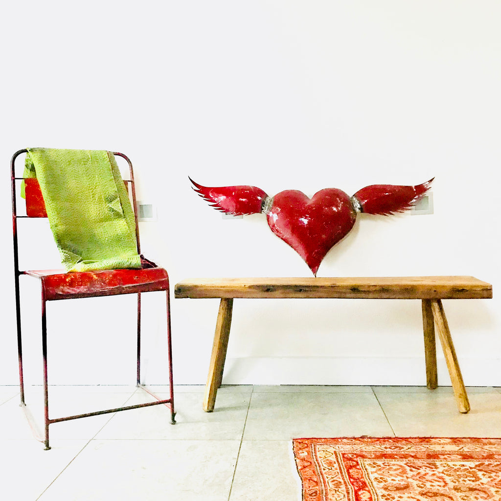 Large Recycled Metal Heart with Red Wings - Wall Art