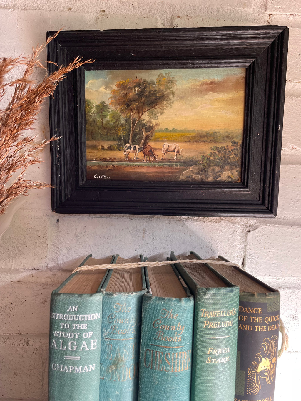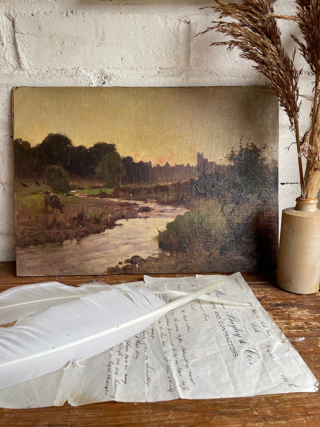 Small 1920s Oil Painting with Cows Grazing at a Stream