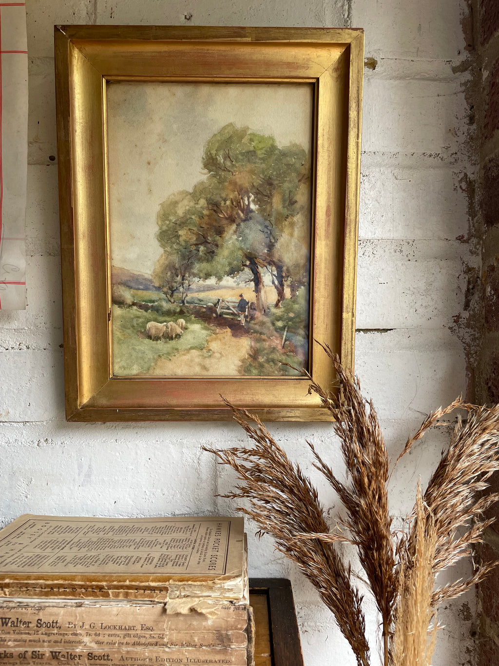 Landscape with Sheep : 19th Century Watercolour with Gilt Frame