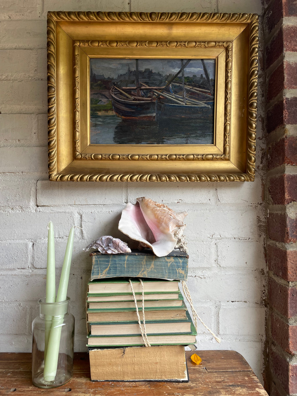 Fishing Boats: Antique Oil on Board with Original Gilt Frame