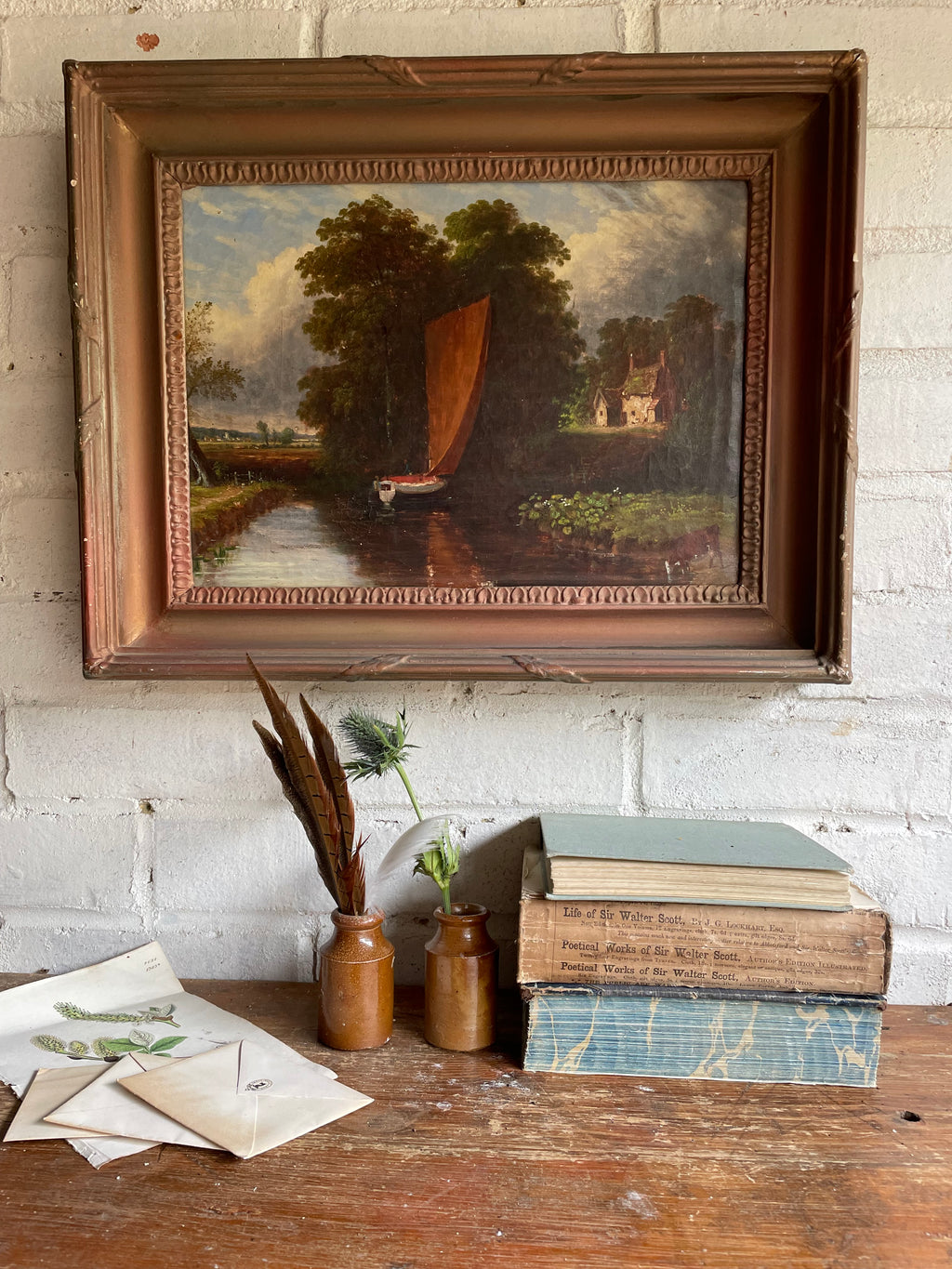 19th Century Oil on Canvas “Rural Landscape with Sailing Boat"