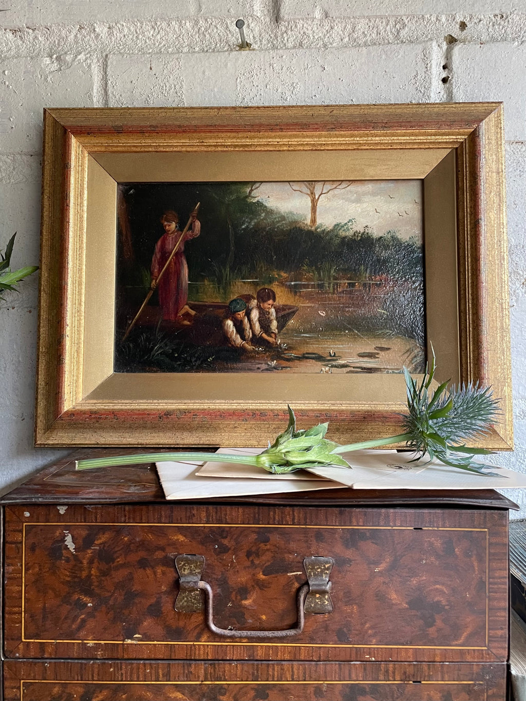 Small 19th Century Signed Oil on Board “Children at the Pond”