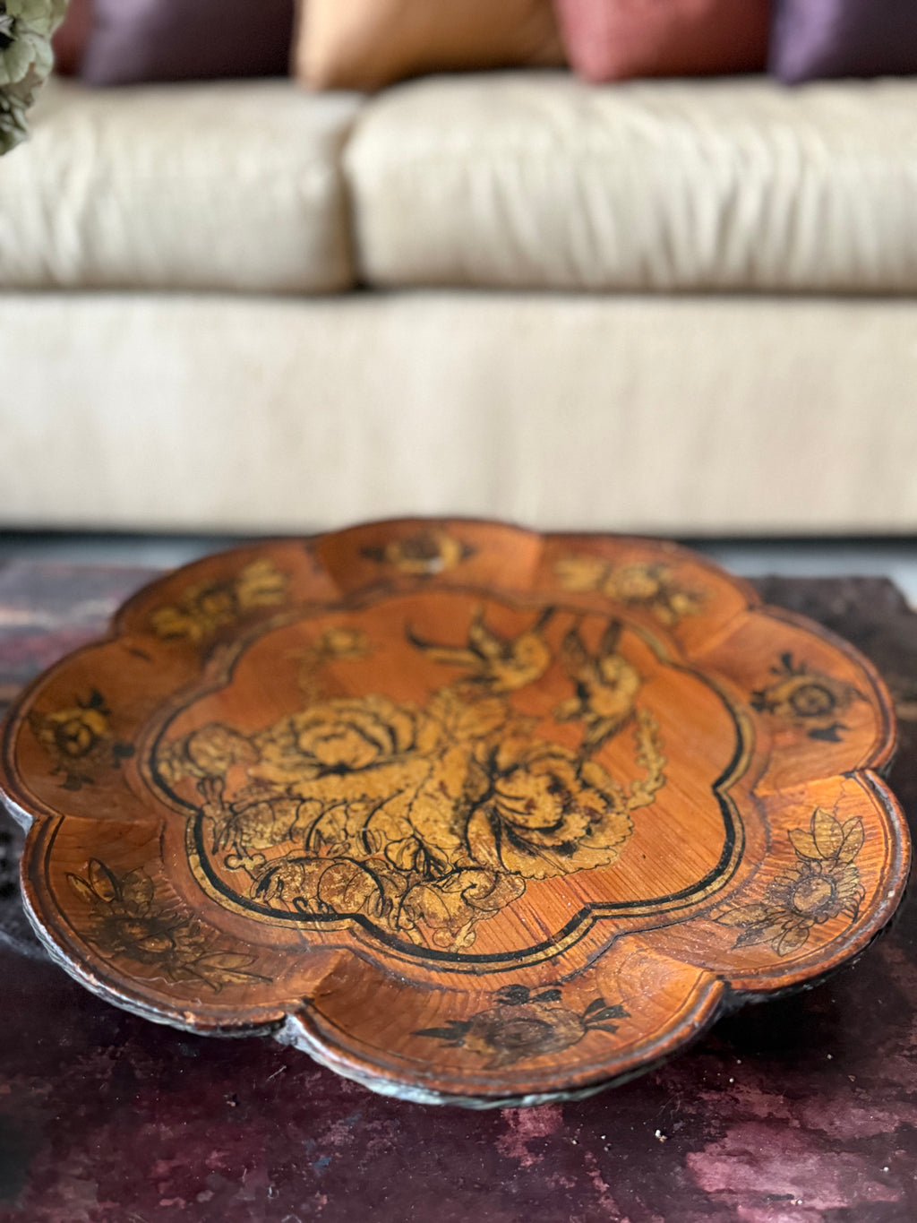 19th Century Handpainted Gold Leaf Scalloped Tray With Birds & Flowers