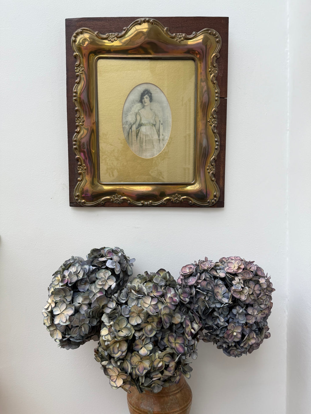 Circa 1910: Portrait Painting of a Lady on Silk with Gilt Metal & Oak Frame