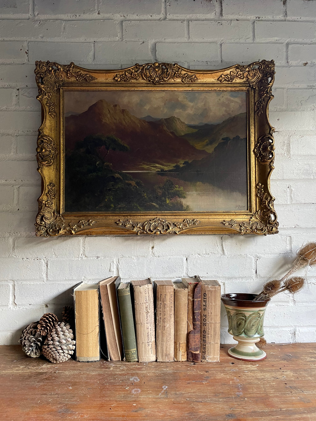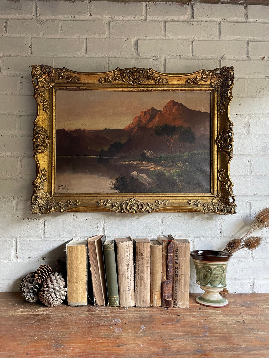 Large Signed 1918 Scottish Landscape Oil on Canvas : “Mountains, Cattle & Lake”