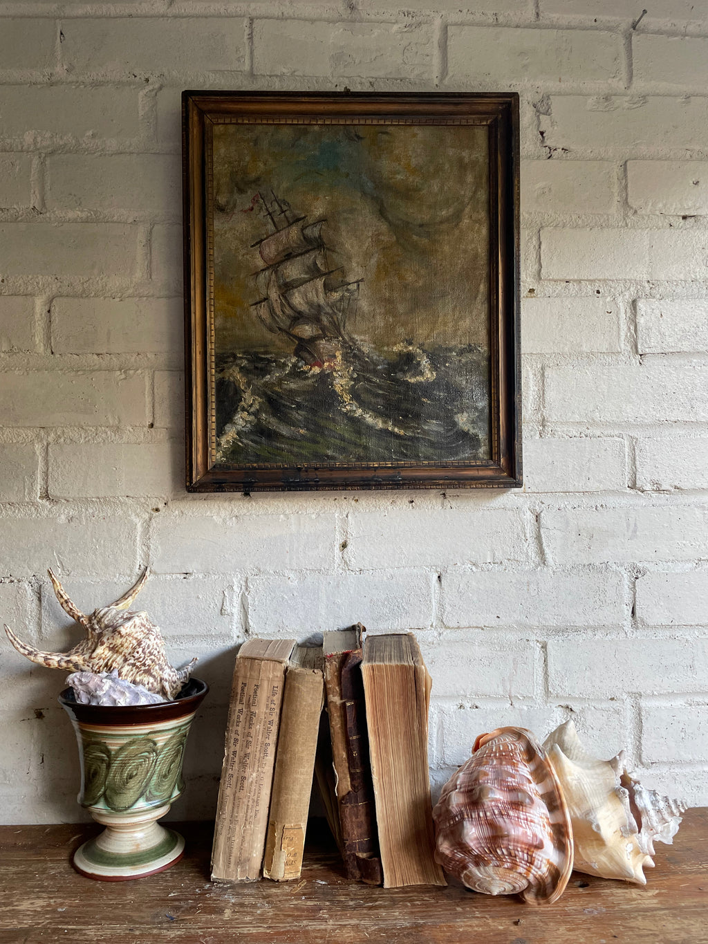 Ship on Stormy Seas: Antique Oil on Stretched Canvas