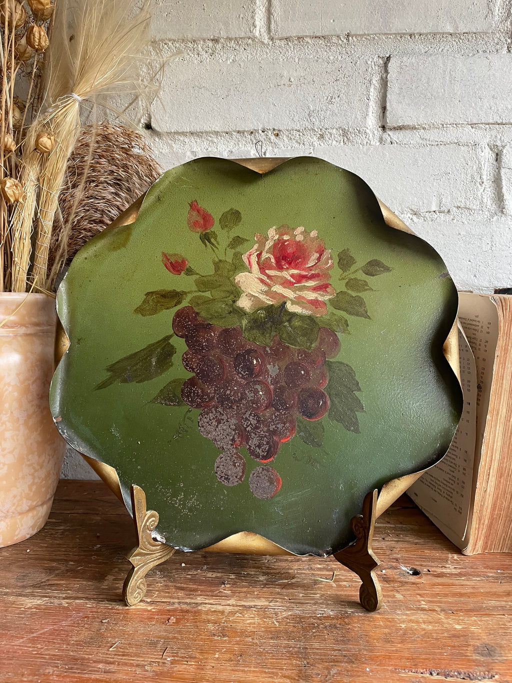 Green Toleware Plate with Handpainted Red and Cream Rose & Grapes
