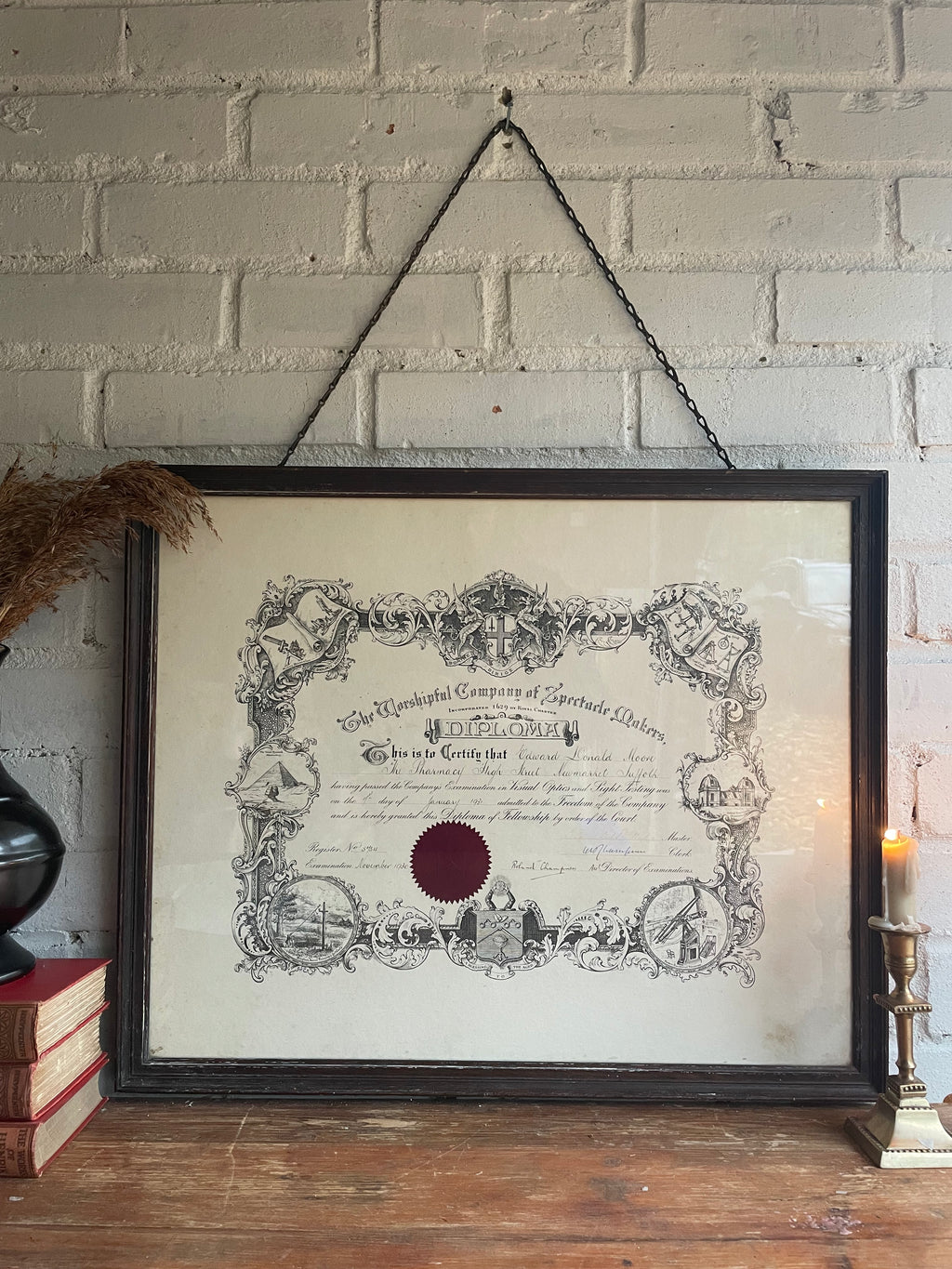 Large Framed 1930s Diploma from “The Worshipful Company of Spectacle Makers”