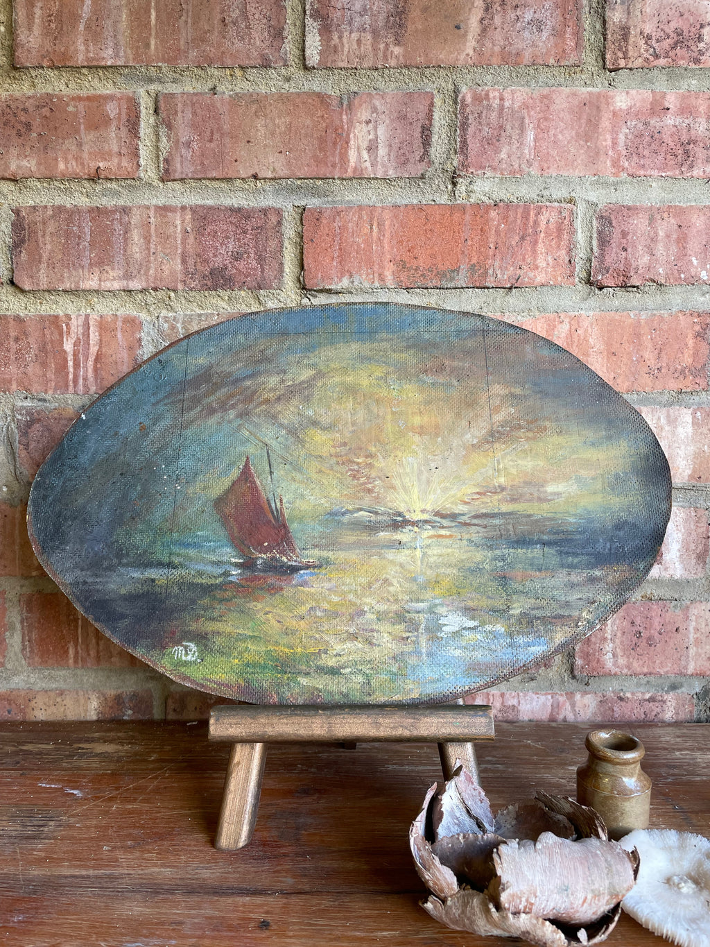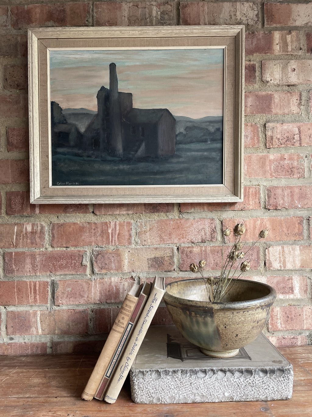 Moody Landscape with Tower and Pink Sky: Oil on Board
