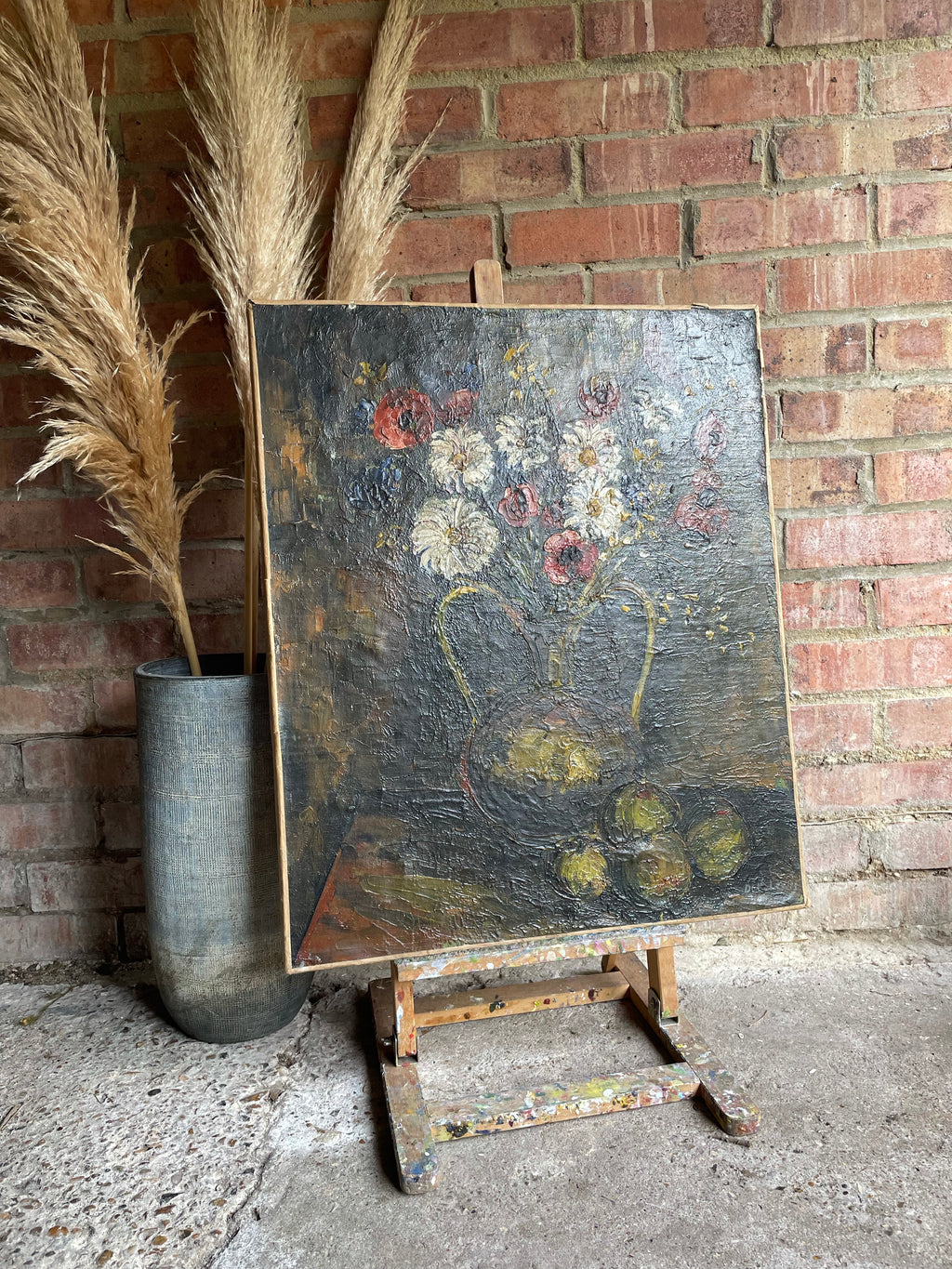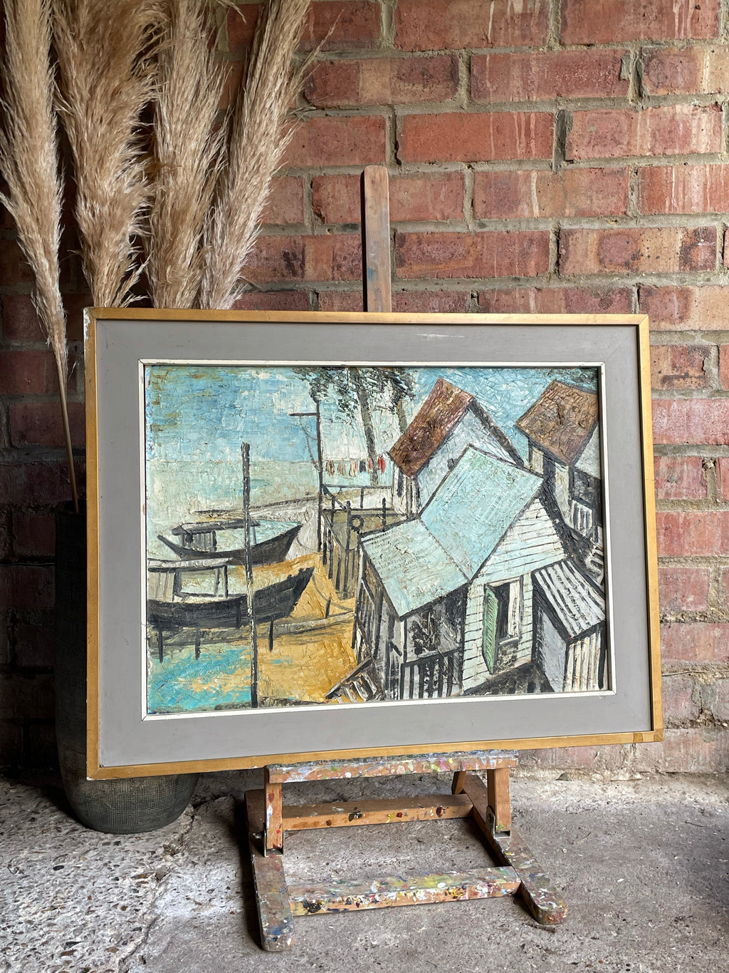 Japanese Village & Boats: Midcentury Signed Oil on Board